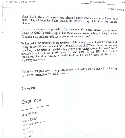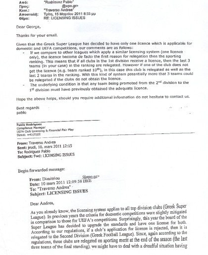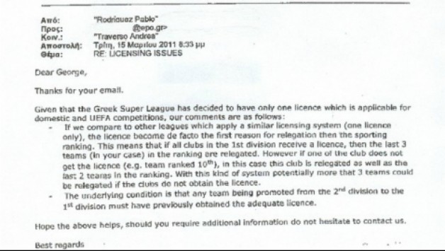 Ο Κώστας Πηλαδάκης έχει στα χέρια του έγγραφο Υπογεγραμένο από τον διευθυντή του τμήμτος αδειοδότησης της ουέφα, Αντρέα Τραβέρσο, στο οποίο η Ευρωπαϊκή Ομοσπονδία ποδοσφαίρου τονίζει ότι τις θέσεις των ομάδων που υποβιβάστηκαν επειδή δεν τους χορηγήθηκε άδεια, πρέπει να πάρουν άλλες από την ίδια κατηγορία. Κάτι που στην ουσία στέλνει Λάρισα και Πανσερραϊκό στην Σούπερ Λιγκ.
