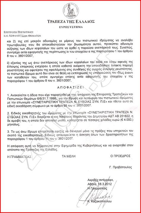 Απίστευτες και υπόγειες μεθοδεύσεις, που αποδεικνύουν ένα παρασκήνιο, το οποίο εκθέτει την Τράπεζα της Ελλάδος και φυσικά όλο το τραπεζικό σύστημα και την ίδια την κυβέρνηση!!! Την ίδια ώρα που στην Λαμία έβαλαν λουκέτο, με αυτό τον ξεδιάντροπο τρόπο, ανακάλεσαν και την άδεια της Συνεταιριστικής τράπεζας Εύβοιας και ΠΗΡΑΝ ΠΑΛΙ ΠΙΣΩ ΤΗΝ ΑΠΟΦΑΣΗ!!!
