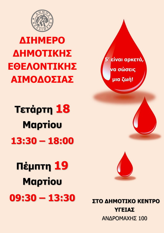 Εθελοντική Αιμοδοσίατην Τετάρτη 18 Μαρτίου από 13:30 έως 18:00