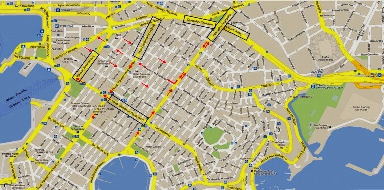 - Μπουμπουλίνας με κατεύθυνση προς το Κεντρικό Λιμάνι (από Ακτή Μουτσοπούλου μέχρι Ηρώων Πολυτεχνείου).